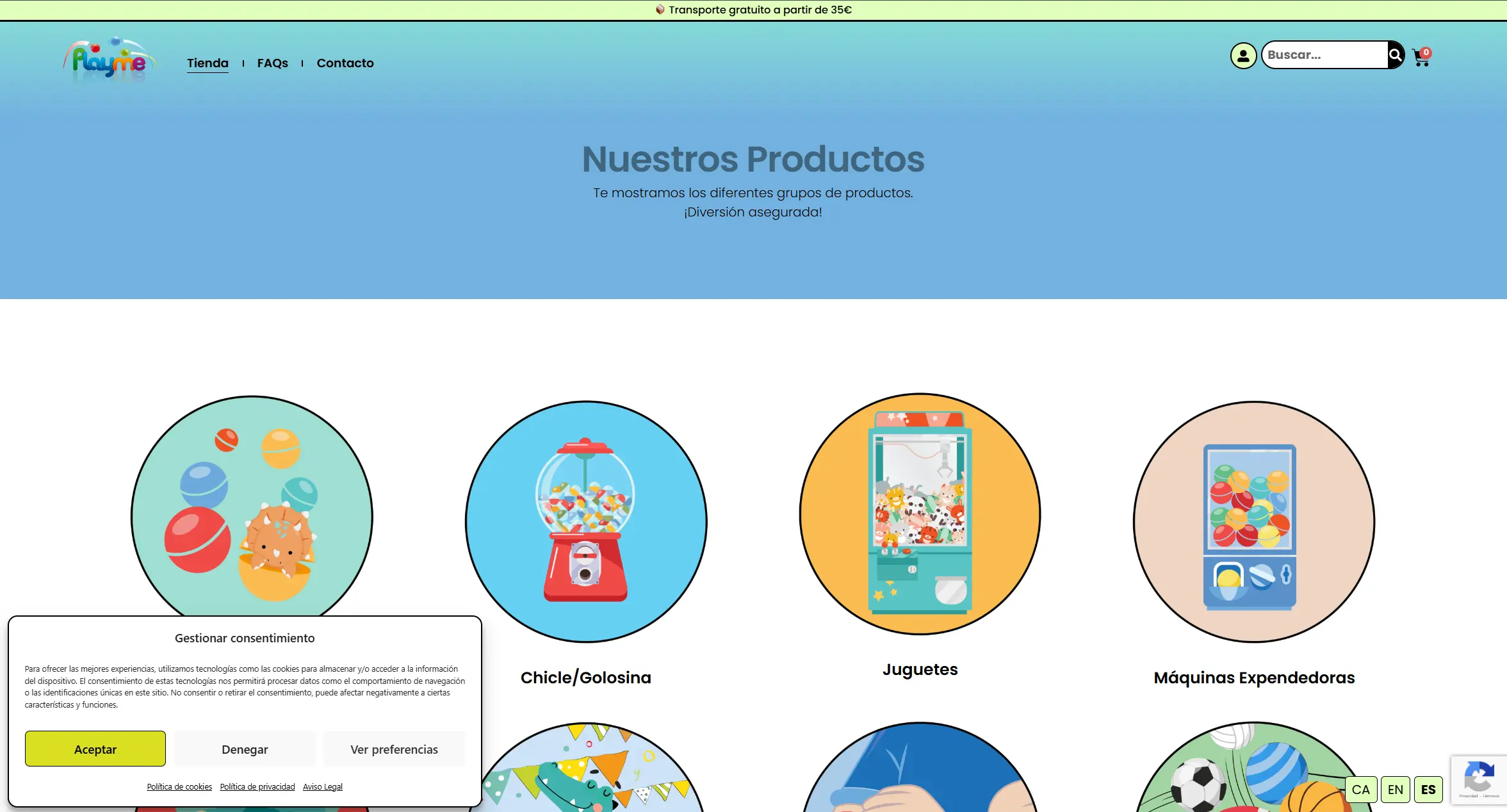 Tienda online oficial de Playme, especializada en productos de vending infantil y coleccionables. Optimizada para posicionamiento web, responsive, con tiempos de carga rápidos y estructura adaptada al cliente objetivo.